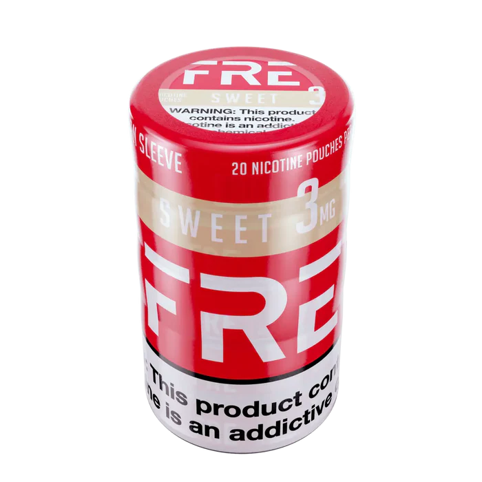 Each can contains 20 slim pouches, with 3mg of nicotine per pouch. FRE Sweet is also available in 6mg, 9mg, 12mg, and 15mg nicotine strengths.
