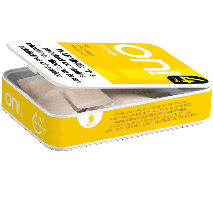 On! Citrus 4mg nicotine pouches are offered by On!, a recognized brand in the U.S. nicotine pouch market. These pouches feature a citrus flavor and come in a mini, dry format with a nicotine strength of 4mg. Each can includes 20 tobacco leaf-free pouches, available for individual purchase or in packs of 5, 10, 25, or 50.