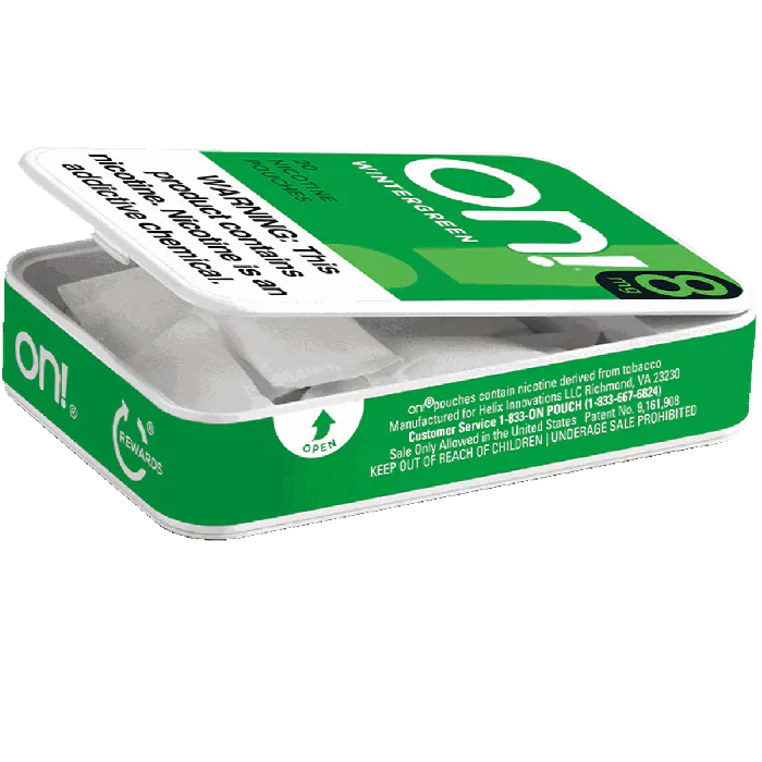 On! Wintergreen 8mg nicotine pouches are tobacco leaf-free and characterized by a wintergreen flavor. With a nicotine strength of 8mg per pouch, each can contains 20 pouches. The wintergreen flavor is also available in two additional nicotine strength options: 2mg and 4mg. The pouches are designed in a mini, dry format and are available for individual purchase or in packs of 5, 10, 25, or 50.